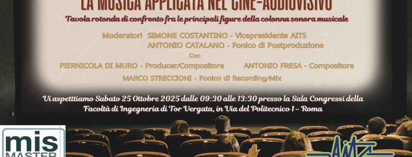 Sabato 25 ottobre 2025 alle ore 9.30 nell’aula Convegni di Ingegneria di Tor Vergata (via del Politecnico 1), ospiteremo questa importante tavola rotonda tra AITS, l’Associazione Italiana Tecnici del Suono, e i fonici e compositori che danno vita alle colonne sonore dei film. E’ un incontro tecnico che aprirà la discussione sul presente e sul futuro di questa disciplina, da sempre alla base delle emozioni che riceviamo dai film.