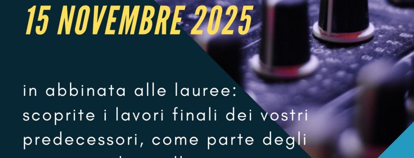 Vi invitiamo all’Open Day del Master in Ingegneria del Suono e dello Spettacolo, sabato 15 novembre alle ore 15.30 nell’Aula Convegni di Ingegneria a Tor Vergata. Abbiamo organizzato una particolare abbinata con le lauree: nelle ore precedenti, infatti, conseguiranno il Master una dozzina di studenti che presenteranno i loro lavori di tesi. Potete così a vostro piacimento “curiosare” tra i tanti possibili orizzonti che il Master apre. In coda, intorno alle 15.30, avremo appunto l’Open Day, durante il quale, in circa 1h30′, cercheremo di darvi un quadro dettagliato della didattica e delle prospettive del “Master Suono”. Siete i benvenuti!